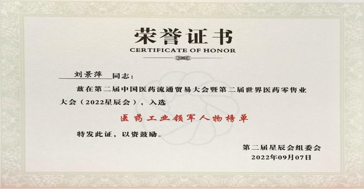 在本次开幕式上,发布了“医药工业领军人物”、“医药零售领军人物”榜单,球速体育药业集团刘景萍董事长凭借在儿药领域多年的努力探索和对行业的杰出贡献,荣获“医药工业领军人物”称号。